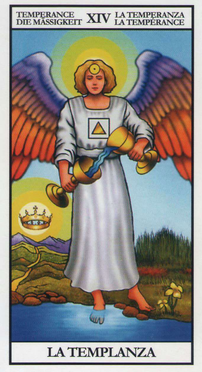Un ángel andrógino con grandes alas rojas vierte líquido entre dos copas de oro, creando un flujo constante que parece desafiar la gravedad. Tiene un pie en la tierra y otro en el agua. En su pecho lleva un triángulo dentro de un cuadrado. Al fondo, un sendero sube hacia unas montañas donde brilla una corona de luz.