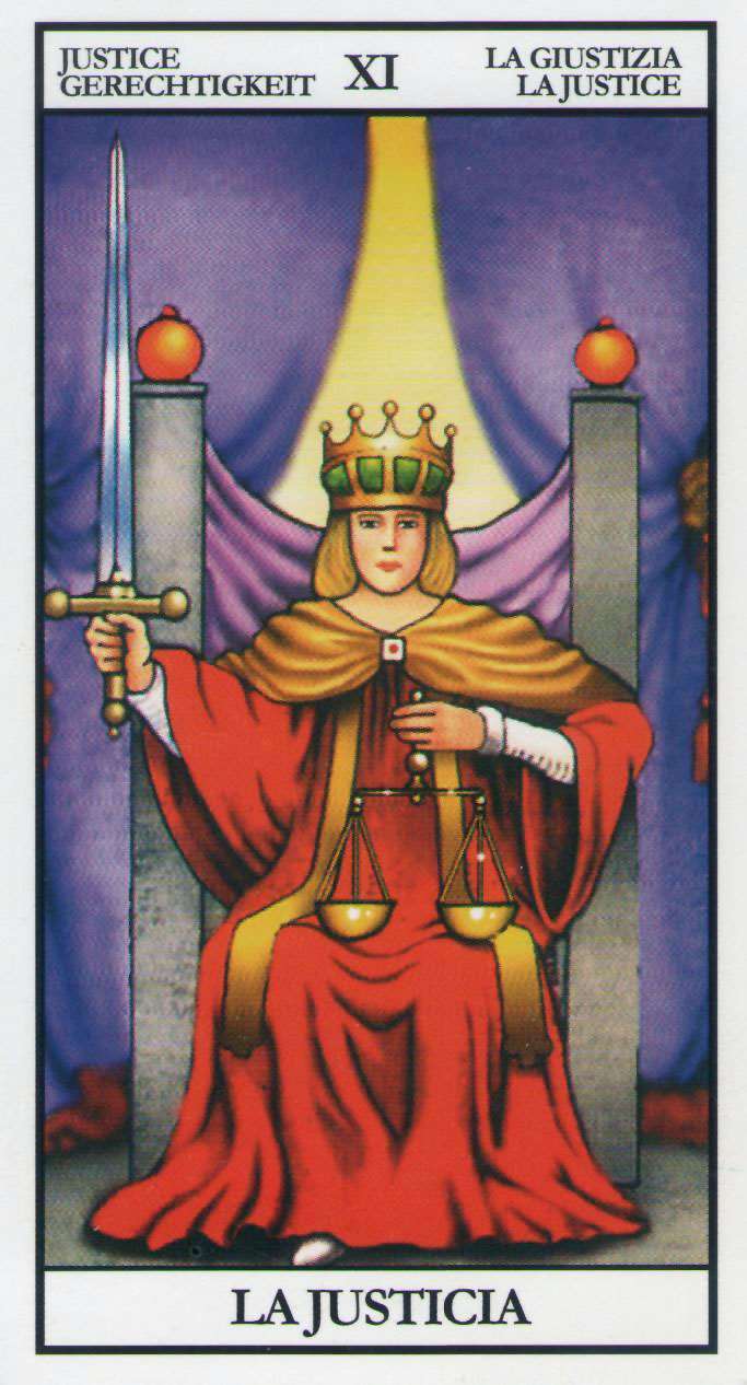 Una figura femenina sentada en un trono entre dos columnas (similares a las de la Sacerdotisa). En su mano derecha sostiene una espada levantada (acción y decisión) y en la izquierda una balanza (equilibrio y peso de las pruebas). Lleva una corona con un pequeño cuadrado que simboliza el pensamiento ordenado y un manto rojo que cubre una túnica azul.